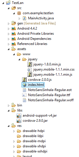 我尝试过很多例子,其中不包括work.Here是我想要做的。我有一个phonegap eclipse project.here是项目结构