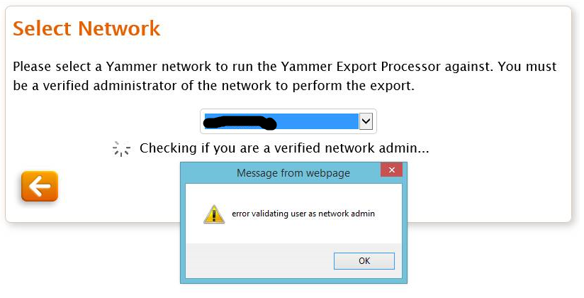 我正在执行上述链接中提到的相同步骤,但是yammer导出处理器(https://yammer.azurewebsites.net/)有一些问题,因为当我选择我的网络时,它通过一个错误来验证用户作为网络管理员的错误。