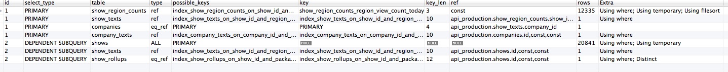 你有LEFT OUTER JOIN show_texts ... ON ... show_texts.show_id IS NOT NULL。这可能是错误的两个原因:(a)如果不寻找LEFT,则不要使用NULL;(b) NULL测试应该在缺少的WHERE子句中,而不是在ON子句中。