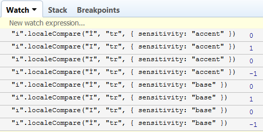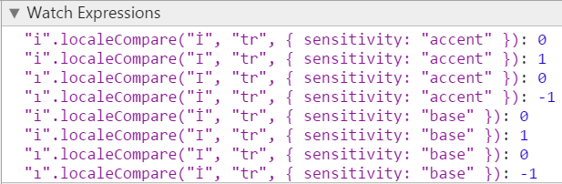 "ı".localeCompare("İ", "tr", { sensitivity: "accent" }) === -1但是在IE11中相同的测试失败了,与有关浏览器兼容性的信息相反。localeCompare的所有上述调用都在IE11中返回0。可以使用sensitivity的另一个值来获得预期的结果。相反,IE9为上述localeCompare调用返回1或-1。我认为它只考虑了第一个参数,并忽略了"tr", { sensitivity: "base" }部分。Chrome的结果看起来是这样的
