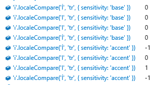 "i".localeCompare("I", "tr", { sensitivity: "accent" }) === 1