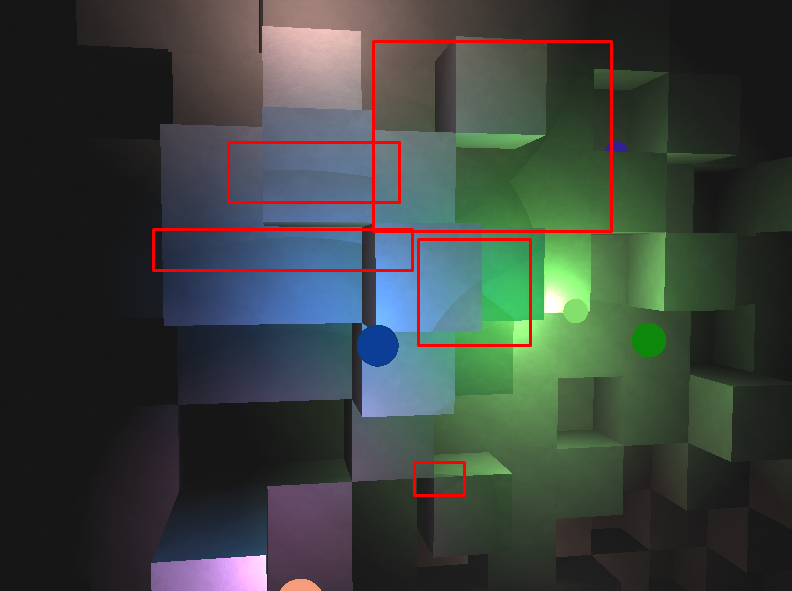 当我将距离检查方程改为if(distance <= lights[i].Size * 2.0f) (大幅度增加光线半径)时,我得到的边框显着减少,但是如果我看得足够近,我会不时地看到它们,所以即使这样也不能完全消除问题。