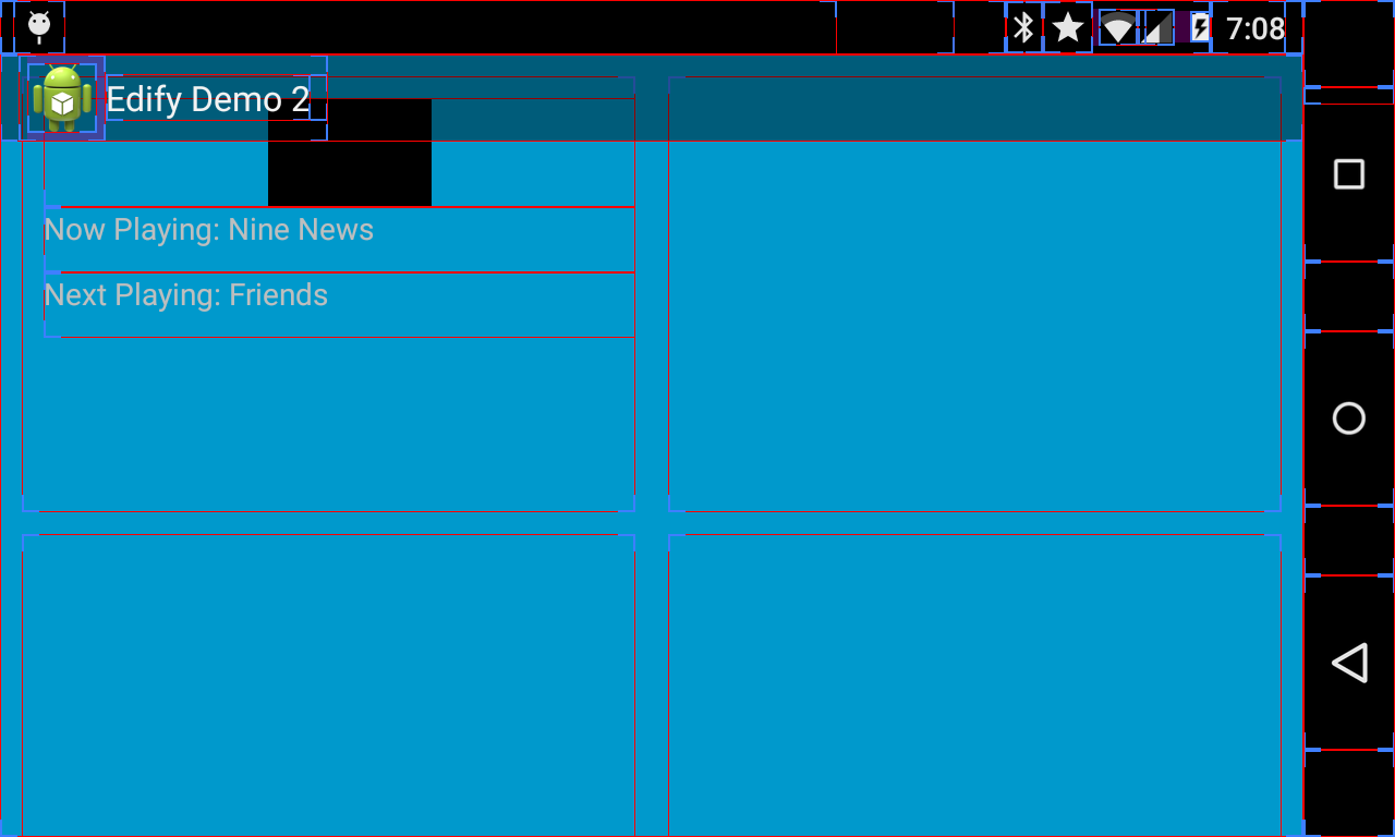 现在,我尝试在Nexus 4上运行这个选项,选中了“显示布局边界”选项。我可以看到Custom1的子级的边界都在正确的位置,并且基于日志,custom2的子级也在正确的位置。但是,只有第一个" custom2“正在正确显示(即第一个custom2显示一个imageView和两个文本视图,其余为空)。