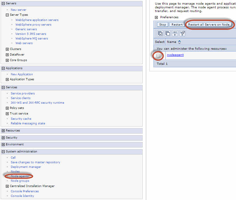 对于WebSphere 7.0.0.15:系统管理员>节点代理>检查节点代理框>重新启动所有节点