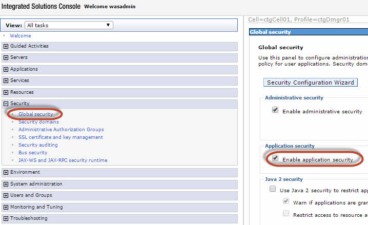 我登录到WebSphere控制台并检查是否启用了应用程序安全性。它是: