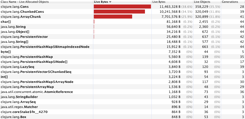 (partition-all step docs)))我用jvisualvm对应用程序进行了描述,发现clojure.lang.Cons、clojure.lang.ChunkedCons和clojure.lang.ArrayChunk过度地控制了这个过程(见图)。这肯定与我使用这个双剂量的循环有关,(以前的实验表明,这种方法比使用map、还原等方法更快,尽管我使用时间来基准这些函数)。我非常感谢您能为我提供的任何见解,以及关于重构代码并使其运行得更快的建议。我想减速机在这里可能会有所帮助,但我不确定如何和/或为什么。