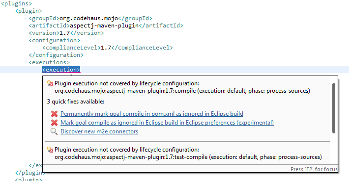 这只是m2e插件的一个问题,您可以使用标记为红色x的两个快速修复程序之一来摆脱它。如果您不想在pom中使用IDE特定的内容,我建议使用第二个(中间)快速修复选项。尽管如此,您还是应该能够通过maven构建,您的方面现在在构建中实际使用了aspectj-maven-plugin吗?