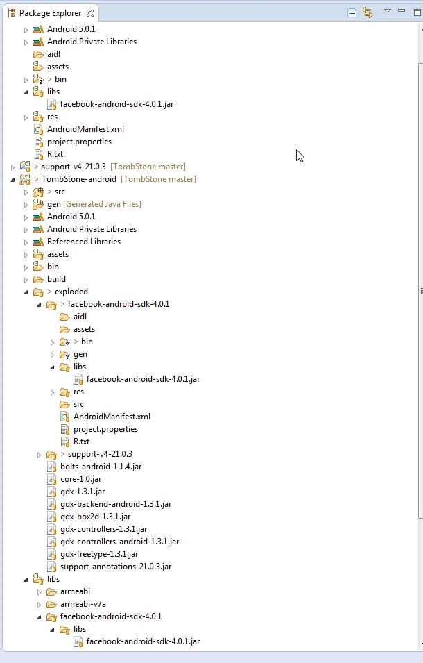 我看过很多关于这个问题的帖子,但到目前为止还没有解决我的问题。我已经在我的项目中“爆炸”了facebook和支持v4。据我所见,facebookSDK.JAR位于我的安卓项目的libs目录和“爆炸”文件夹中。以及在实际的Facebook项目中。看起来是这样的: