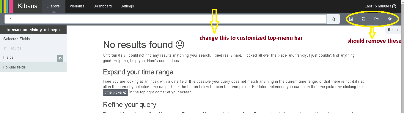 我已经在我的Linux机器上安装了kibana-4。我的要求是,我想删除选项,如保存搜索字段在我的基班纳主页,我想改变基班纳的顶部菜单通过我自己的定制菜单。这是我想做的事情的快照。