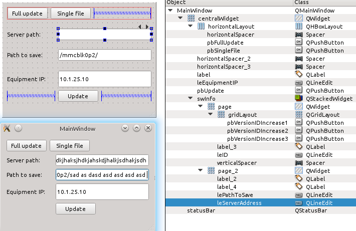 好的,我拿了你的ui文件,放在我的QtCreator测试项目中,结果很好--我没有你在更新的屏幕截图中显示的剪裁行编辑的问题。也许有一些剩余的调整整个窗口的大小-如果你调整窗口的大小会发生什么。无论我在做什么,我都不能触发同样的行为