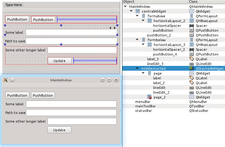 我对上面和下面的部分使用了表格布局。中间有堆叠的小部件。线输入的右边是正确对齐的,左边也是对齐的。我通过将堆叠小部件的所有边距设置为0来实现这一点,而表单布局边距已经是0。此外,我使用垂直布局的整个形式,这是必要的适当对齐三个布局在一起。问题是如何在标签结束和行编辑开始之间对齐该部分。我认为这是不可能的,如果不黑客的最小/最大的标签大小或任何东西在左边。