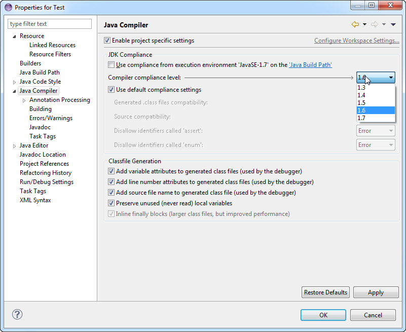 如果您将遵从级别设置为"JRE 6",它将相反地将Java 6源文件编译为Java 6类文件。
