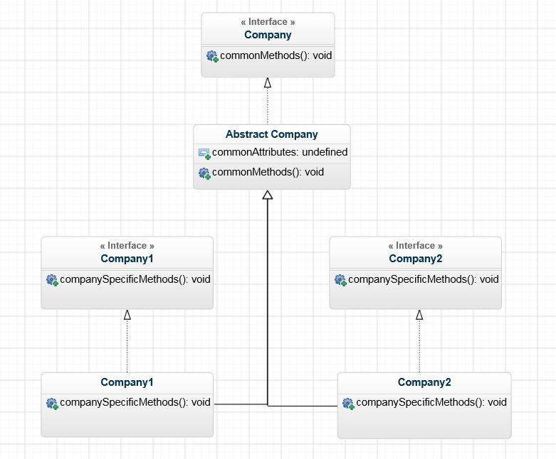 您可以使用一个接口CompanyTemplate,它将包含A、B和C公司应该实现的所有通用方法-