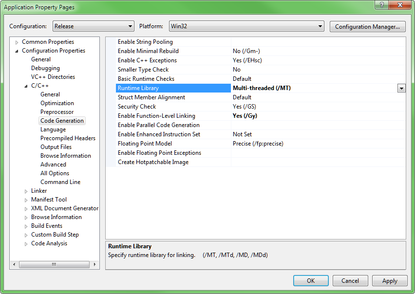 c)在项目设置中启用“静态”链接。这将把所有东西放在您自己的EXE文件中;它将使用更多的内存,但不再依赖于外部文件。在VS:如何使用2005制作一个完全静态链接的.exe?中可以找到这个