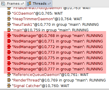 我成功地运行了网络服务发现并连接到所需的网络,但是在停止发现之后,NsdManager线程仍然在运行。这就导致了这样的情况:经过几次屏幕轮转之后,有许多NsdManager线程正在浏览连接。