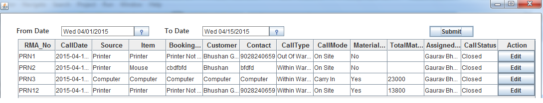 String sql1="SELECT RMA_No,CallDate,Source,Item,BookingDesc,Customer,Contact,CallType,CallMode,MaterialRequired,TotalMaterialRequiredCost,AssignedTo,CallStatus FROM RMA_Master WHERE (((CallDate) Between #"+fromdate1+"# And #"+todate1+"#)) AND CallStatus='"+Status+"'";