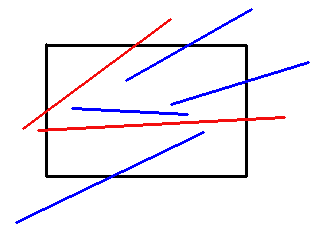 在解决这个问题之前,想象一个更严格的问题版本,其中所有的线段都是水平的或垂直的。在这种情况下,与矩形相交的任何水平段都应该与矩形的左(右)垂直边相交。如果我们把水平段看作区间,把矩形的垂直边看作点,问题是要找出包含点的所有区间。因此,我们可以使用区间树来解决这个问题。同样,我们可以找到所有相交的垂直线段。