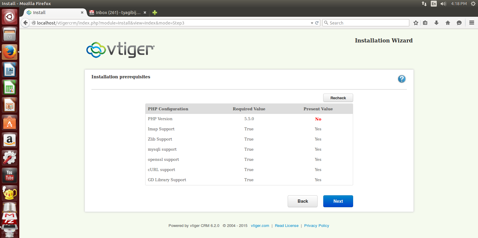 但是在vtigercrm安装时,当前的PHP值显示No。