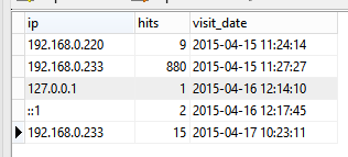 将visit_date (datetime)列更改为visit_date (date)列和visit_time (time)列,然后创建作为主键的id列。最后,将ip + date设置为唯一的密钥,以确保同一IP不能在一天内输入两次。