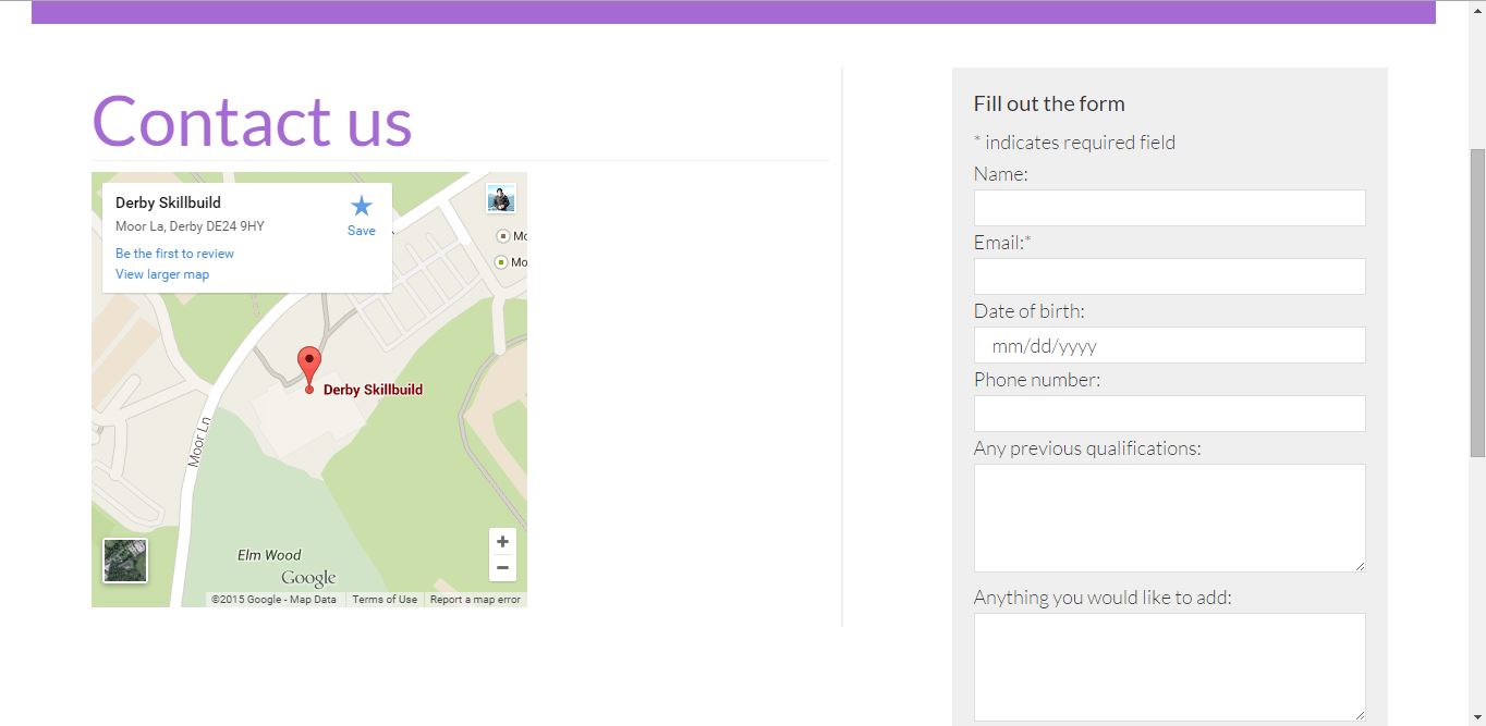 <iframe src="https://www.google.com/maps/embed?pb=!1m14!1m8!1m3!1d1203.5916684263602!2d-1.460736!3d52.891122!3m2!1i1024!2i768!4f13.1!3m3!1m2!1s0x48798c70cf2a2d8f%3A0x193e5babe5839de!2sDerby+Skillbuild!5e0!3m2!1sen!2suk!4v1426363000948" width="400" height="400" frameborder="0" style="border:0"></iframe>
