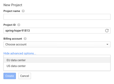 在这个文档https://cloud.google.com/appengine/docs/location中,据说我可以在欧盟设置托管基于google引擎的web应用程序的服务器,但是在创建新的GAE应用程序时,我找不到“显示高级选项”按钮。还可能吗?