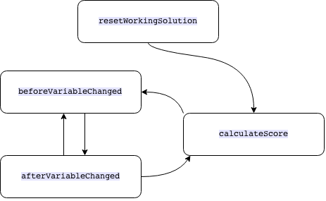 我的模型支持通过Solver#addProblemFactChange和ProblemFactChange接口进行实时更改.实现了这个接口的doChange方法,我通过beforeEntityRemoved、beforeProblemFactRemoved、beforeProblemFactChanged等方法积极地使用scoreDirector的通知。此外,模型的增量计分计算器实现了回调方法beforeEntityAdded、beforeEntityRemoved及其after-versions。