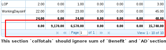 在此图像colTotals部分的页脚显示所有列的和,在这里,我无法排除Benefit和AD组的求和。