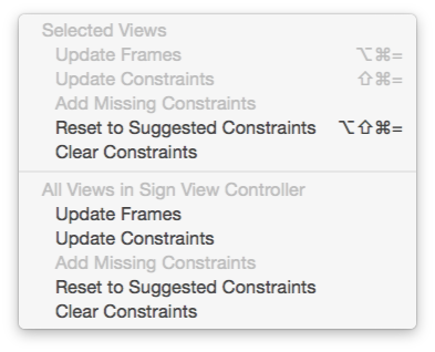 对于约束条件,我转到右下角,点击一个有两个挤压杆的三角形的按钮(看起来有点像一个星球大战战斗机,座舱里有一个三角形)。我向下滚动到显示视图中的所有视图控制器的部分,我点击了清楚的约束。然后,我返回到相同的按钮,但这一次,我点击添加缺少的约束。