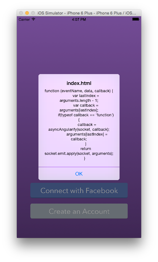 ionic run ios --target="iPhone-6-Plus"运行应用程序时,套接字连接将无法工作ionic serve在浏览器中为应用程序提供服务时,套接字连接工作。我的代码