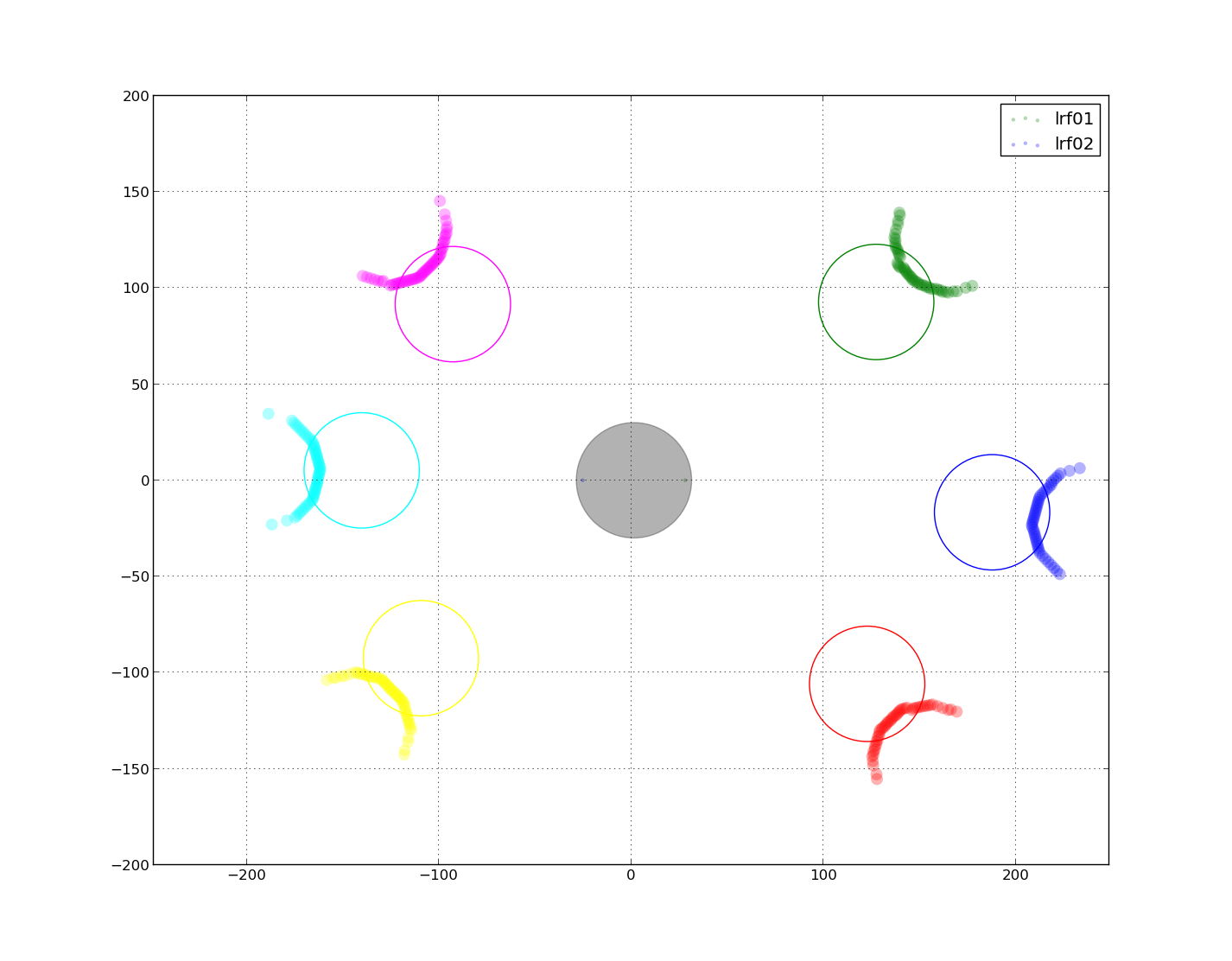 算法的结果显示在图片中。散点点表示激光测量,圆周以算法返回的点为中心。灰色半透明形状表示机器人进行扫描(在这个形状的左边和右边的激光)。