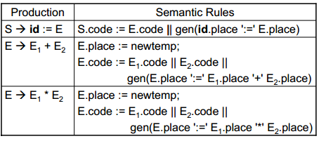 这组规则描述了一种属性文法,一种用于计算树的属性的方案。这类计划几乎都是纯功能性的(没有副作用)。它计算每个规则/树节点的属性,在它们使用的表示法中命名为X.Y,其中X代表规则/树(例如,带有变体E1和E2的S和E)。Y表示计算的属性(在本例中,有"code“和"place”属性)。