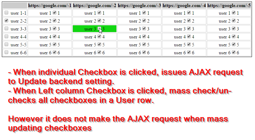 });现在单击要大量更新一行的复选框时,更新的JSFiddle http://jsfiddle.net/jasondavis/7597y7q5/6/发出AJAX请求X列数。因此,在一行中的所有复选框都会被选中和未选中,对于每个复选框也有一个AJAX请求。