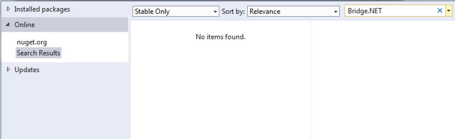 我们有一个套餐拒绝出现在Visual中的NuGet包管理器搜索结果中。搜索Bridge.NET应该返回结果。