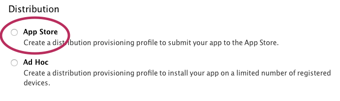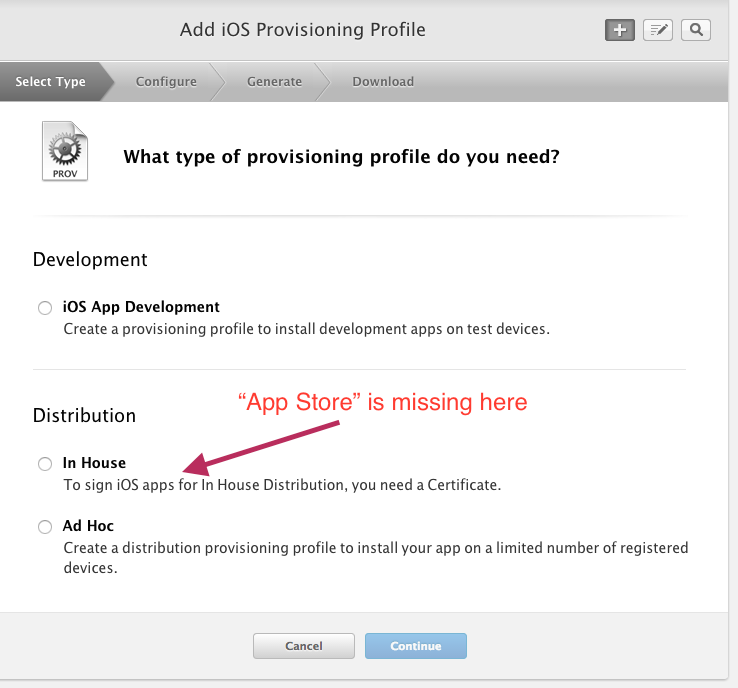 但是,当我们想要创建一个分发到App的配置文件时,它没有任何有用的操作。我们只允许以InHouse和AdHoc的形式发布。“应用商店”在这里丢失: