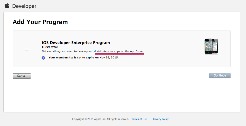 我还试图注册正常的开发人员计划,但我们是不允许的,因为我们已经是企业开发人员计划的成员。正如上面的第一个截图所示,除了“企业计划”之外,没有办法签署另一个项目。