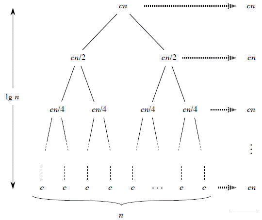 因此,每一个递归步骤--输入被分成两部分,然后征服部分取O(n),所以树的每一层代价为O(n),最棘手的部分可能是递归级别(树高)的数目是否可能被指定。这或多或少是简单的。因此,在每一步中,我们将输入分成n/2元素的两个部分,然后递归地重复,直到我们得到一些恒定大小的输入。在第一层,我们将n/2除以下一个n/4,然后再除以n/8,直到达到一个恒定大小的输入,这将是树的一个叶,最后一个递归步骤。