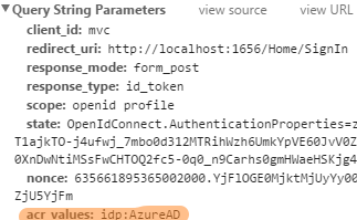 //set acrvalues. the value of the `idp`, (which is `Google` in this case) must match with the `AutheticationType` you set in IdentityServer