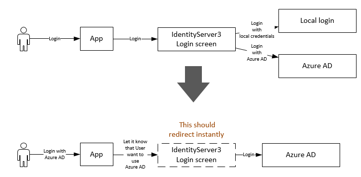 在常规流程中,一旦应用程序需要对用户进行身份验证,它就会将用户重定向到IdentityServer3登录屏幕--这很好。但在某些情况下,在每次请求的基础上,我想绕过登录屏幕,让IdentityServer3知道用户希望立即使用特定的外部身份提供者登录。