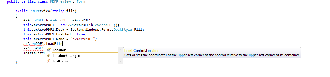 以防万一还有人需要解决办法。我使用Acrobat,实际上有AxAcroPDF.LoadFile()方法。然而,它不起作用,也就是什么都没有发生:/