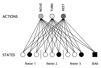我的第一个假设是建立一个两层网络,输入层的输入神经元和有状态的输入神经元一样多,输出层的输出神经元和动作的输出神经元数量一样多。每个输入将完全连接到每个输出。(因此,实际上,它看起来就像上面的矩阵)