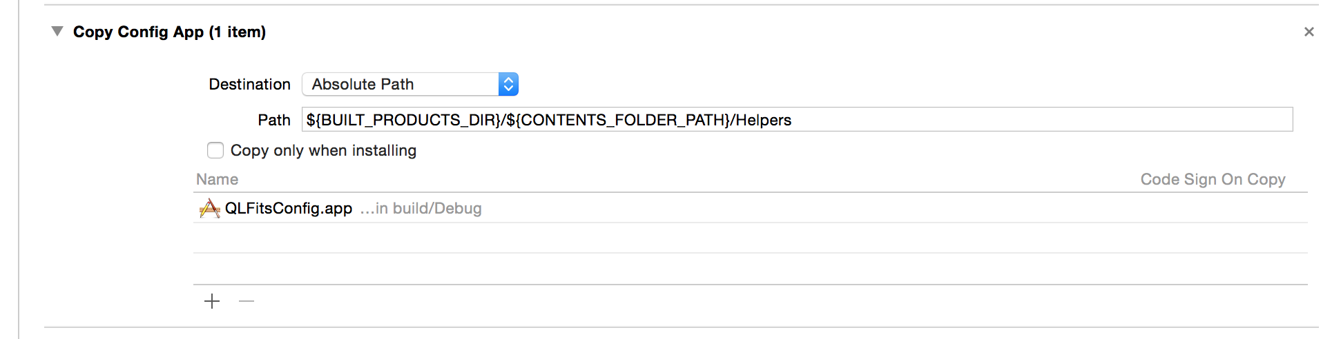 现在,回到QL发生器。在生成器的“构建阶段”中,将配置应用程序作为“目标依赖项”。此外,添加一个新的“复制文件”构建阶段(在复制捆绑资源构建阶段之后),以便在QL包中复制该助手应用程序(见图)。