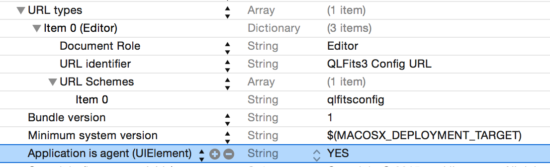 首先,在Xcode工作区/项目中创建一个小助手应用程序目标。我的QL生成器名为QLFits,我选择了QLFitsConfig。