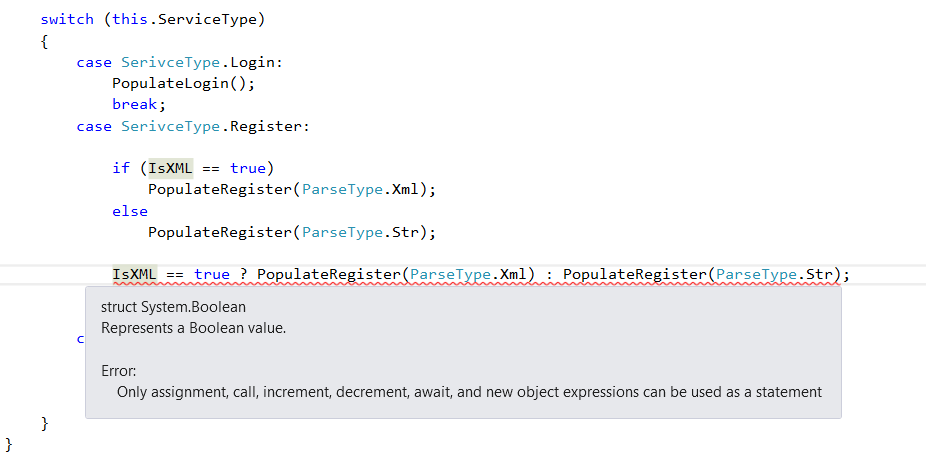 我这里有一段代码。在case ServiceType.Register:中,我有两个类似的语句,一个使用常规的if语句,另一个使用三元操作符?/:。对于if语句VS报告没有错误。然而,在这一行: