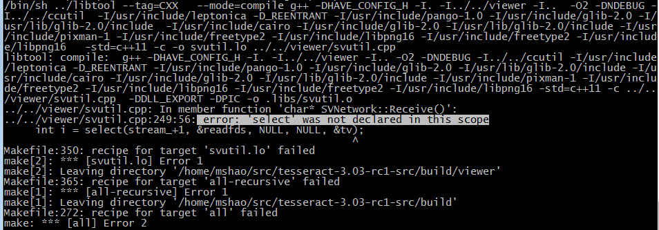 我开始使用MSYS2 + MinGW-w64编译Tesseract 3.03。在经历了所有的依赖和先决条件之后。我终于成功地configure了Tesseract 3.03 source。然后在make过程中遇到以下错误