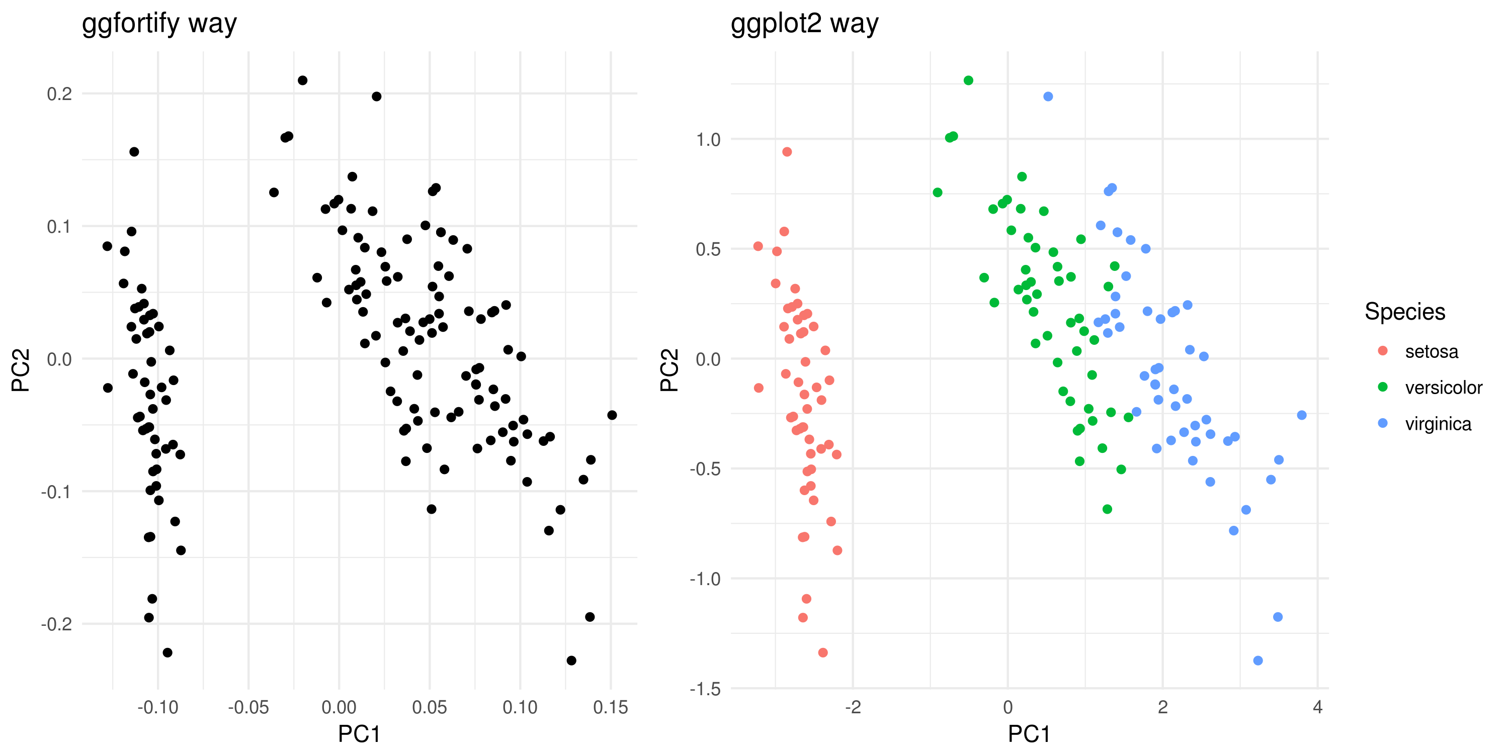 即使ggfortify简单易用,我也不鼓励它与标准ggplot2函数(例如警告replacing previous import ‘dplyr::vars’ by ‘ggplot2::vars’ when loading ‘ggfortify’)重叠使用。一个明智的解决办法是直接使用ggplot2。