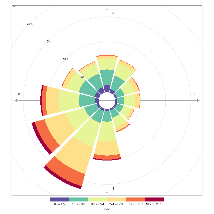 windRose(mydata, ws="ws", wd="wd", breaks=c(0,1.5,3.3,5.4,7.9,10.7),