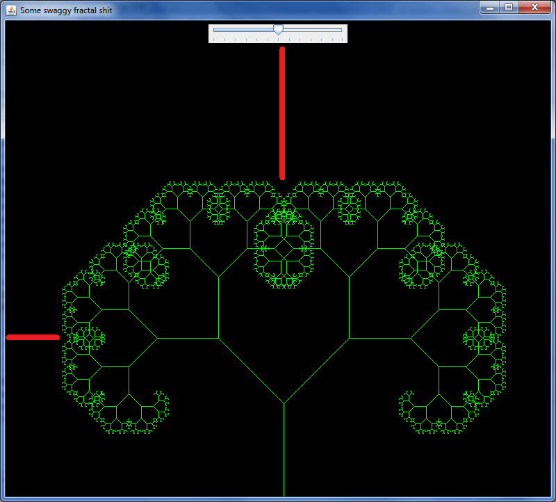我有一个分形树生成器,我试图使滑块控制迭代的次数,但我无法使它工作。而且,每当调用repaint()方法时,布局就会变得一团糟。对如何解决这个问题有什么想法吗?