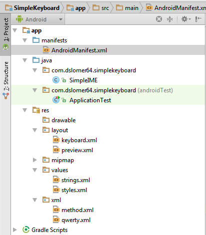 我做这个“自定义键盘”是因为我遵循了此链接中精彩的轮廓,而没有使用ECLIPSE。我使用Android (作为) 1.1.0。