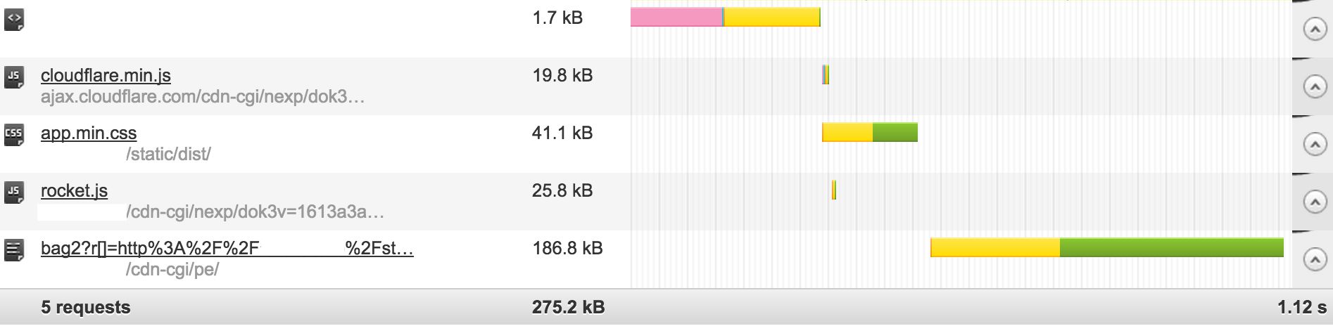 从Chrome访问我的网站时,我注意到没有任何迹象表明CloudFlare正在为我工作。响应中没有CF-RAY或cloudflare nginx头。此外,克莱尔扩展显示CloudFlare不是活动的。但是,当我用WebPagetest测试网站时,我可以看到所有与CloudFlare缓存系统一起服务的javascript文件。