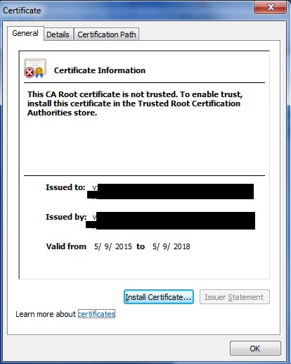 背景:我正在构建一个内部站点,希望用户能够下载服务器的根证书,并将其作为“受信任的根证书颁发机构”安装在他们的Windows证书信任商店中。当用户打开证书文件时,他们到达常规证书检查屏幕。